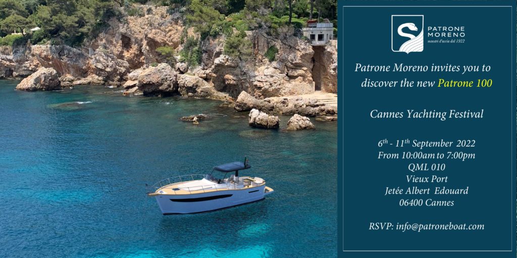 Patrone Moreno is pleased to invite you to the upcoming September Boat Shows. In Cannes we are delighted to present Patrone 100 as world premiere, and in Genoa to exhibit not only the new P100, but also the elegant Patrone 30’ Special and the timeless Patrone 27’ Cabin.