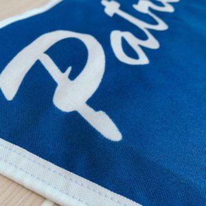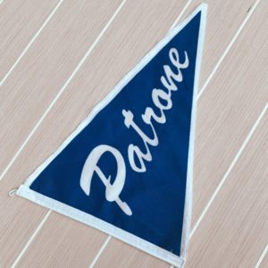 Triangular flag in blue polyester fabric with white logo.