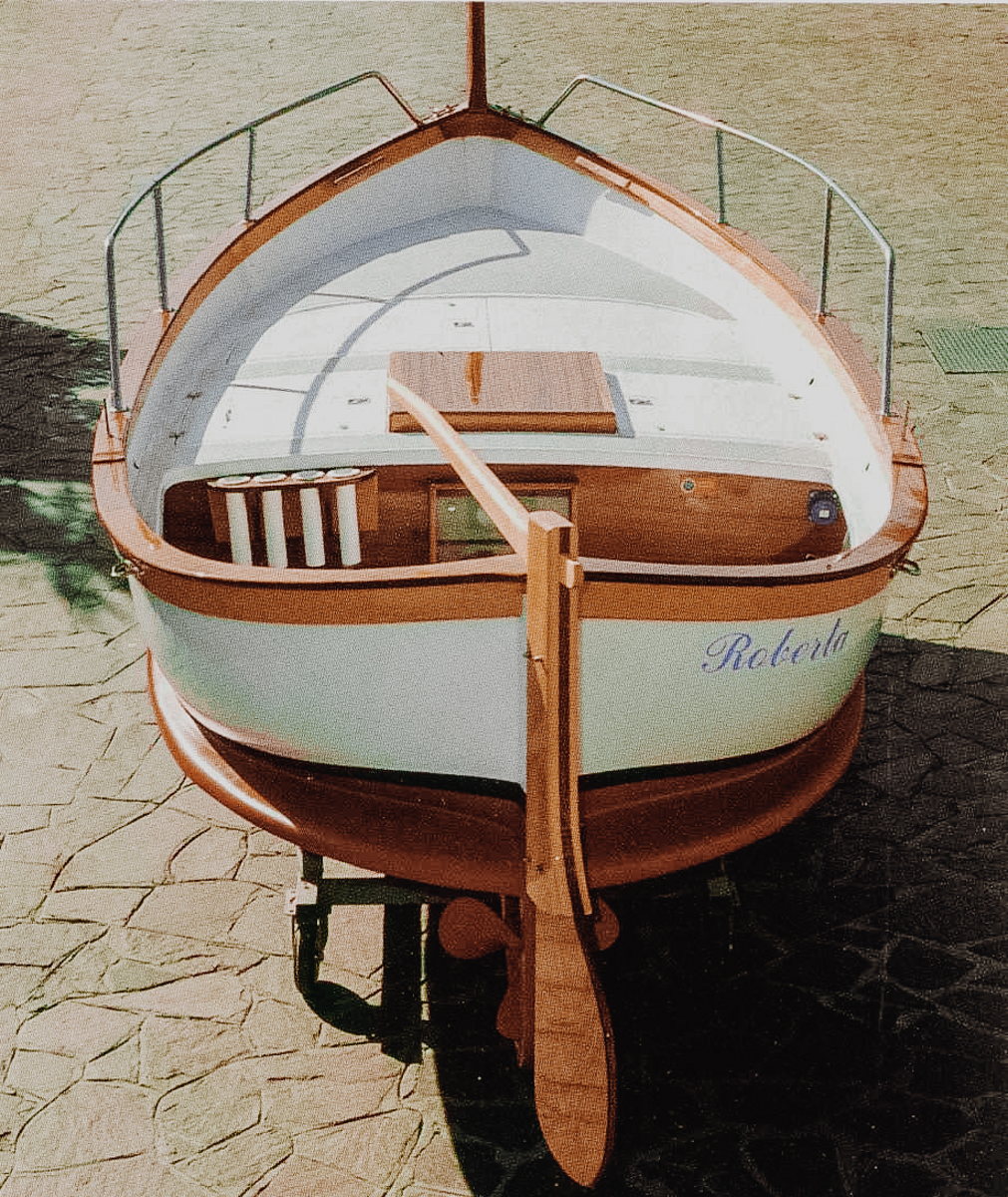 Dotato di ottima manovrabilità sia a motore che a remi, è una barca molto asciutta in navigazione con ottima stabilità e scarso rollio sull’onda. Tutta la coperta è ad un unico livello, ciò ne facilita l’utilizzo, sia come prendisole, sia come gozzo classico togliendo i portelli. Lo scafo è costruito in vetroresina stratificata a mano con irrigidimenti strutturali e doppio fondo in vetroresina per una riserva di galleggiabilità. La coperta è in vetroresina a sandwich stratificata a mano. Tra i banchi ed il doppio fondo montiamo paratie verticali in legno compensato di iroko, mogano, okumè per un migliore utilizzo degli spazi. Gavone motore chiuso ed insonorizzato. I bordi, di fattura classica, sono in legno massello di iroko o frassino o mogano e ne completano l’estetica classica del gozzo. Quattro scalmiere con scalmo in acciaio inox, forniti in dotazione, per l’utilizzo del gozzo a remi. Ottimo per le gite di piacere sottocosta così come per la pesca sportiva.