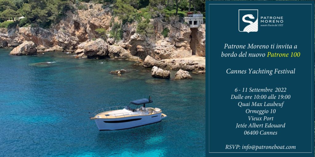 | Patrone Moreno è lieto di invitarti ai Saloni Nautici di Settembre che ci vedono partecipi a Cannes con l’anteprima mondiale del Patrone 100 ed a Genova con il P100, ma anche l’elegante Patrone 30’ Special e l’intramontabile Patrone 27’ Cabin. |